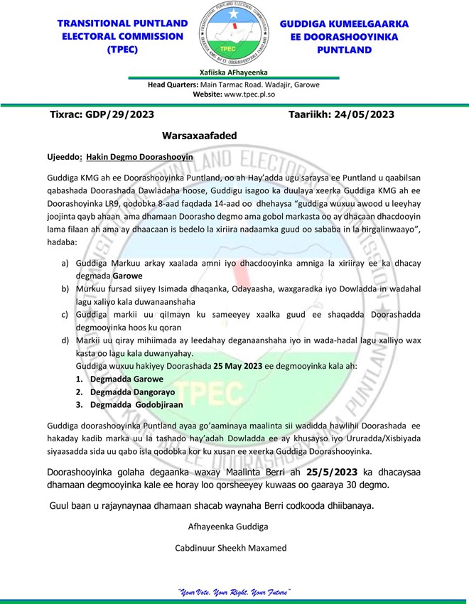 Arbaco, May 24, 2023 (HOL) - Guddiga doorashooyinka Puntland ayaa hakiyay doorashada saddex degmo oo ay kamid tahay Garowe, sababa la xiriira xaaladda amni iyo dhacdooyinkii lidiga ku ahaa doorashada ee ka dhacay Garowe.