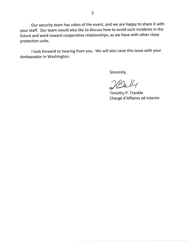"Ciidamadeenu waxay ku sugnaayeen iridka goobta ay ka dhacaysay munaasabaddu, ilaalada Raysal wasaaraha iyo madaxweynaha Koonfur Galbeed waxay bahdileen xubno ka mid ah kooxdeena ammaanka qaabilsan ilaalada labada masuul ee Raysal Wasaaraha iyo Madaxweynaha dowlad gobaleedka Koonfur Galbeed hub ayay ula soo baxeen wayna u gacan qaadeen saddex xubnood oo ka mid ah shaqaalaha Safaaradda" ayaa lagu yiri warka ka soo baxay Safaaradda Mareykanka.