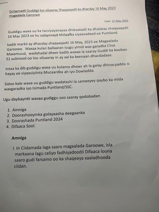 Sabti, May 27, 2023 (HOL) - Guddi loo xilsaaray kasoo go'aan gaarista muranka ka taagan doorashada golaha degaanka degmooyinka Garowe, Dangorayo iyo Godob Jiraan, ayaa caawa soo saaray go'aan rasmi ah.