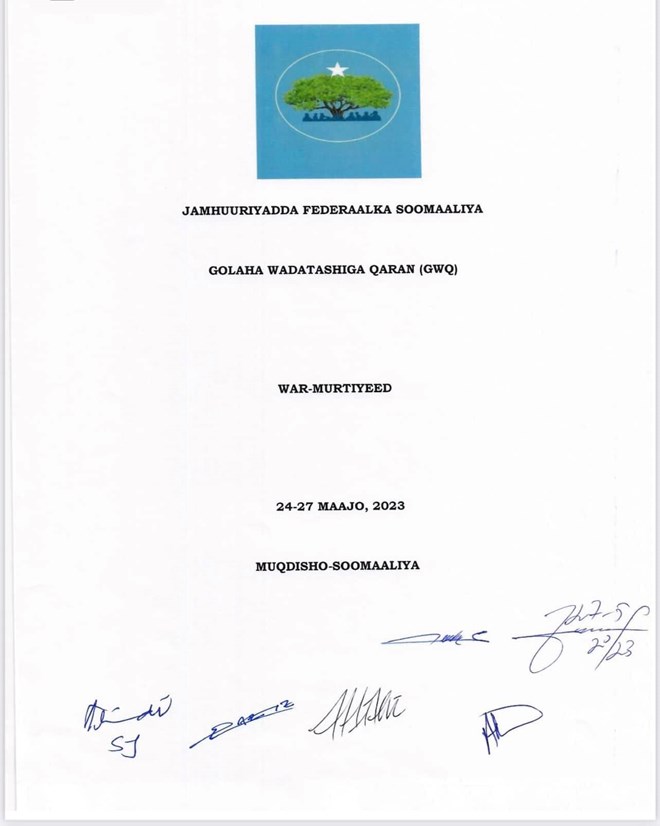 Axad, May 28, 2023 (HOL) - Golaha wadatashiga qaran ee Soomaaliya ayaa xalay goor dambe war saxaafadeed kasoo saaray shirkii uga socday magaalada Muqdisho, iyagoo heshiis ka gaaray arrimaha doorashada.