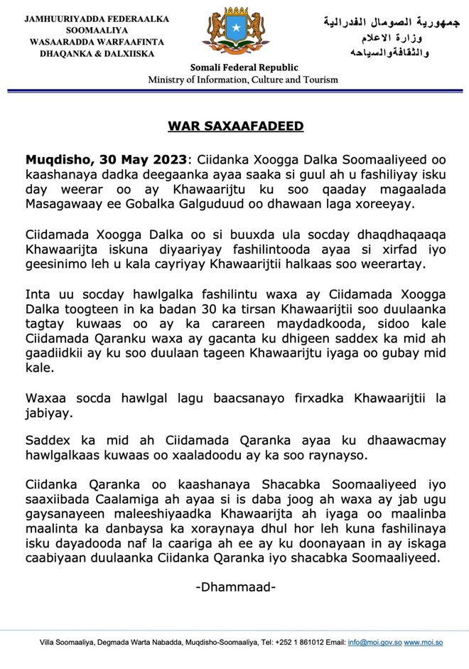 Talaado, May 30, 2023 (HOL) - Dowladda Soomaaliya ayaa war rasmi ah kasoo saartay weerar kooxda Alshabaab ay saakay waaberigii kusoo qaadeen degaanka Masagawaa ee gobolka Galgaduud.