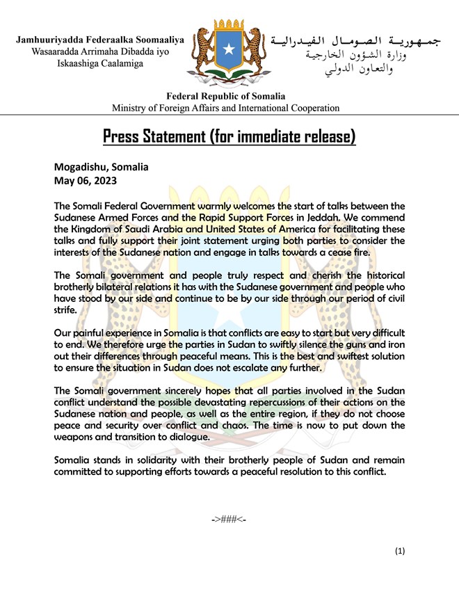 Axad, May, 7, 2023 (HOL) - Dowladda Soomaaliya ayaa soo dhaweysay wada-hadallada nabadeed ee u dhaxeeya dhinacyada isku haya dalka Suudaan, wada hadalladaas oo uu martigelinayo Sacuudiga, waxayna ku baaqday in la dhaqan galiyo xabbad joojinta.