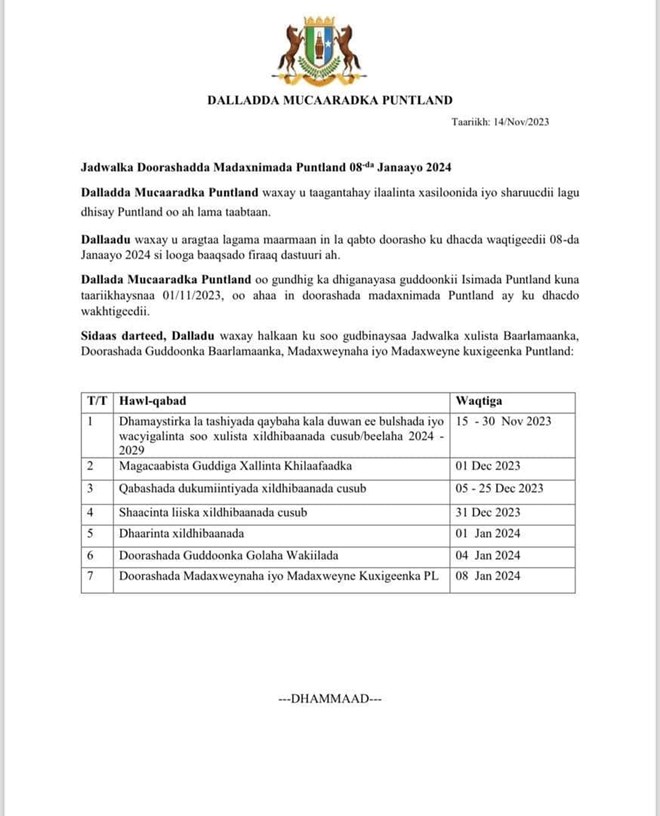 Talaado, November, 14, 2023 (HOL) - Dallada mucaaradka Puntland ayaa maanta oo talaado ah waxay soo saareen jadwalka doorashada baarlamaanka iyo madaxtooyada, iyagoo sheegay in ay ka ambaqaadayaan go’aankii kasoo baxay shirkii golaha Isimada.
