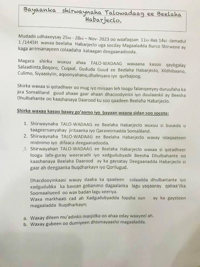 Talaado, November, 28, 2023 (HOL)- Shirwayne loogu magacdaray Talowadaag oo ay iskugu timid beelwaynta Bariga Burco, ayaa laga soo saaray baaq nabadeed iyo colaadeed oo ku wajahan colaadii baryahan ka taagnayd deegaanada Yayle iyo Buqdharkayn ee gobolka Sool.