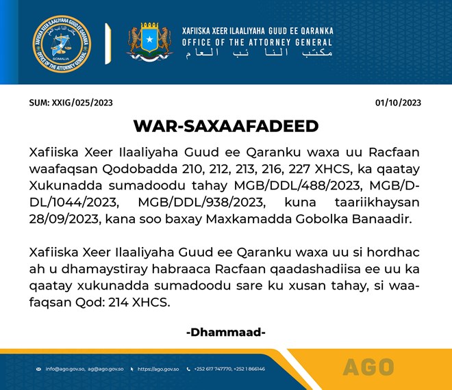 Axad, October, 1, 2023 (HOL) - Xafiiska xeer ilaaliyaha guud ee Qaranka, ayaa racfaan ka qaatay xukunnadii maxkamadda gobolka Banaadir kasoo baxay, kaasoo dambi loogu waayay qaar kamid ah masuuliyiintii lagu eedeeyay musuq maasuqa iyo ku tagri fal awoodeed.