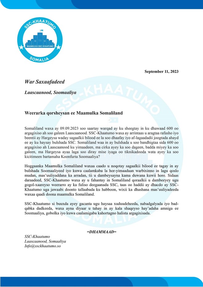 Isniin, September, 11, 2023 (HOL) - Qoraal kasoo baxay SSC Khaatumo ayaa lagu sheegay in Somaliland ay qorshaynayso dagaalo ay ka fuliso deegaanada SSC.
