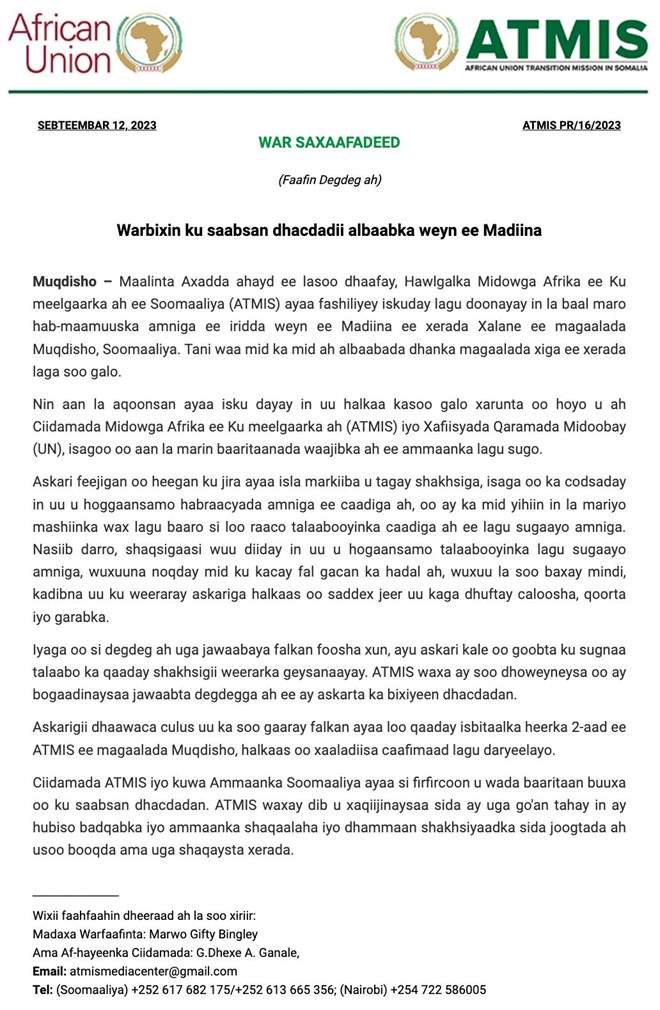 Talaado, September, 12, 2023 (HOL) - Howlgalka ATMIS ayaa war saxaafadeed kasoo saaray shaqaaqo sababtay dhimasho, taasoo axadii ka dhacday halka loo yaqaano Madiino Gate oo ah illinka hore ee xerada Xalane.