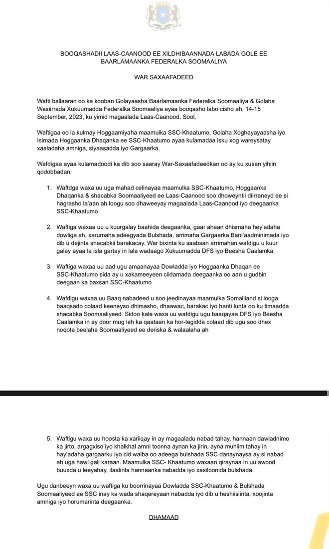 Xildhibaanada labada aqal waxay baaq nabadeed u direen Somaliland, si looga fogaado colaad dambe oo uu dhiig ku daato. Waxay sidoo kale Dowladda federaalka ugu baaqeen inay doorka ka qaadato ka hortagga colaad dambe oo ka dhacda magaalada Laascaanood.