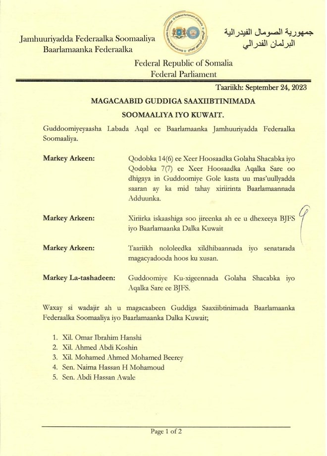 newsinsideGuddiyada cusub oo ay magacabeen labada guddoomiye ayaa ah kala ah guddiyada saaxiibtinimada Baarlamaanka Fedaraalka Soomaaliya u qaabilsan Baarlamaanada dalalka Qadar iyo Kuwait.