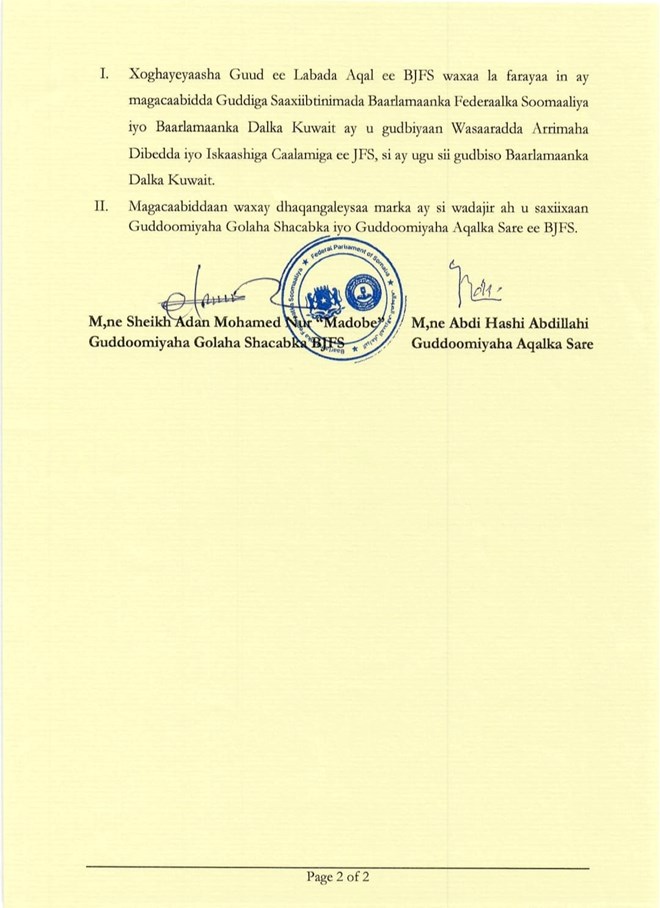 Guddoonka ayaa faray xoghayeyaasha guud ee labada Aqal in magacaabistan ay sida ugu dhaqsaha badan ugu gudbiyaan wasaaradda arrimaha dibedda iyo iskaashiga caalamiga ee dowladda Soomaaliya si ay ugu sii gudbiso Baarlamaanada dalalka Qatar iyo Kuwaut.