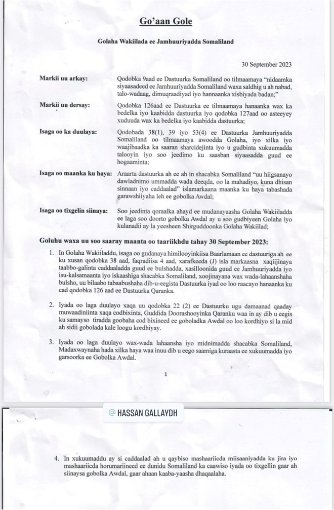 Sabti, September, 30, 2023 (HOL) - Golaha Wakiilada Somaliland oo ka jawaabaya tabasho ay soo jeediyeen qaar kamid ah xildhibaannada gobolka Awdal, ayaa ku baaqay in dib loo eego dastuurka, saami qaybsiga, iyo xarumaha codbixinta gobolka.