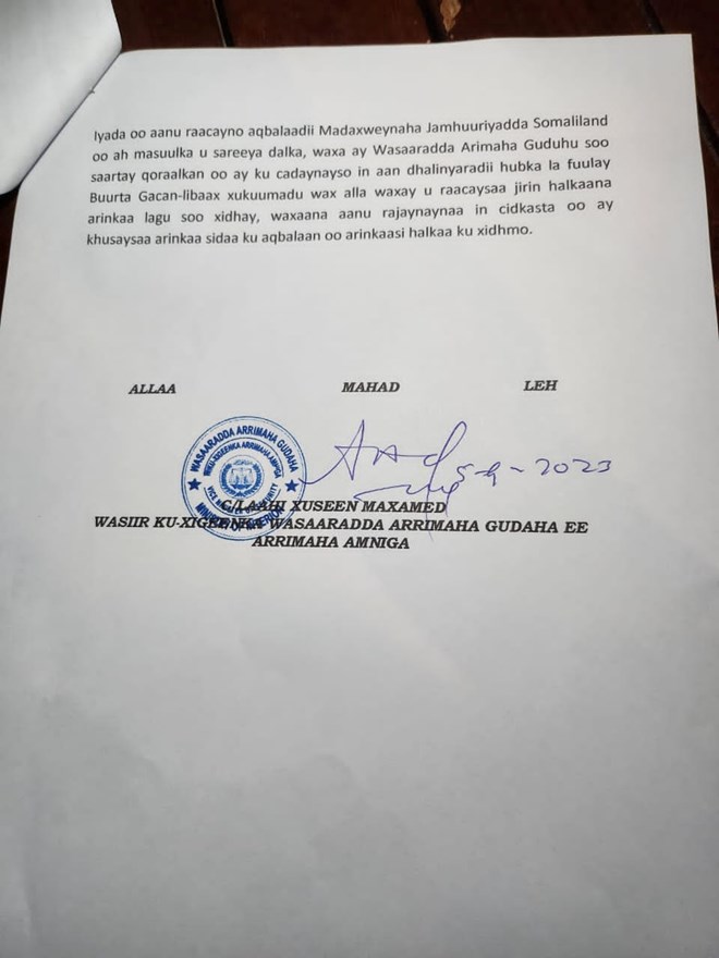"Waxa ay wasaarada arrimaha guduhu soo saartay qoraalkan oo ay ku caddaynayso in aan dhallinyaradii hubka la fuushay buurta Gacan-libaax xukuumadu wax iliyo wax ay u raacaysa jirin, halkaana arrinkaa lagu soo xidhay" ayaa lagu yidhi qoraal kasoo baxay Wasaarada Arrimaha Guddaha Somaliland.