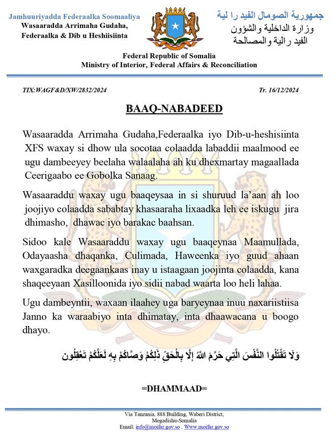 Isniin, December, 16, 2024 (HOL) - Wasaaradda Arrimaha Gudaha, Federaalka iyo Dib-u-heshisiinta XFS ayaa sheegtay in ay si dhow ula socoto colaadda labaddii maalmood ee ugu dambeeyey beelaha walaalaha ah ku dhexmartay magaallada Ceerigaabo ee Gobolka Sanaag.