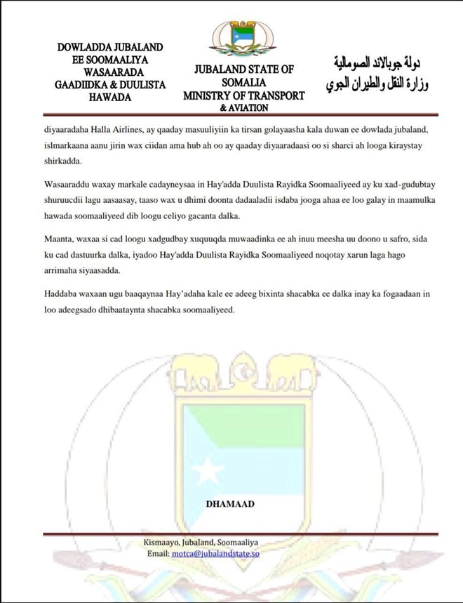 Arinta diyaaradaha Halla Airlines, waxa ay Jubbaland cadeeysay in ay qaaday masuuliyiin ka tirsan golayaasha kala duwan ee Jubbaland, islmarkaana aanu jirin wax ciidan ama hub ah oo ay qaaday diyaaradaasi oo si sharci ah looga kiraystay shirkadda.
