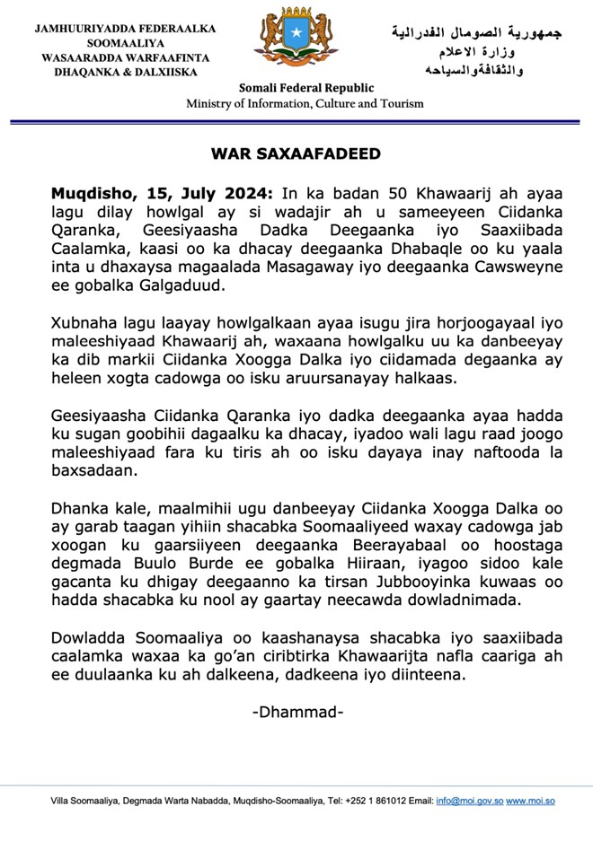 Isniin, Luulyo, 15, 2024 (HOL) - Dowladda Federaalka Soomaaliya ayaa sheegtay, in ka badan 50 Shabaab ah in lagu dilay howlgal ay si wadajir ah u sameeyeen Ciidanka dowladda, iyo Saaxiibada Caalamka, kaasi oo ka dhacay deegaanka Dhabaqle oo ku yaala inta u dhaxaysa magaalada Masagawaay iyo deegaanka Cawsweyne ee gobalka Galgaduud.