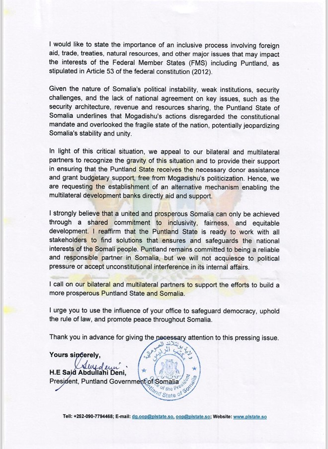 “Waxaan u kuurgalnay isbeddelka murugsan ee xukuumadda Muqdisho, taasoo deeqaha u isticmaalaysa ajandayaal siyaasadaysan tan iyo markii la ii doortay mar labaad. Siyaasadeynta Mashaariicda, Barnaamijyada iyo Taageerada Miisaaniyadda Dawladda Puntland ayaa socday 18-kii bilood ee ugu dambeeyey. Dhawr jeer ayaanu arrintan u soo gudbinay bangiyada horumarinta iyo deeq-bixiyayaasha.” Sidaas ayaa lagu yiri qoraalka Puntland ay la wadaagtay beesha caalamka.