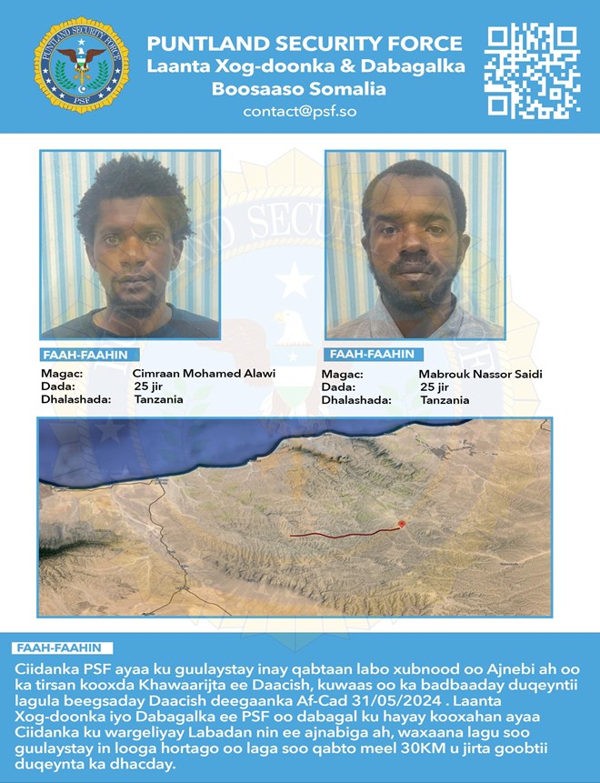Sabti, Juun, 8, 2024 (HOL) - Ciidanka nabad sugidda Puntland ee lagu magacaabo PSF, ayaa shaaciyay inay gacanta ku dhigeen labo xubnood oo katirsan kooxda Daacish oo kasoo jeeda dalka Tanzania.