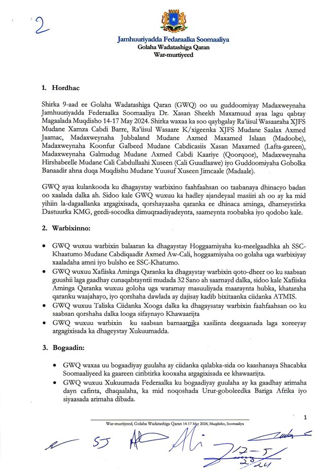 Jimco, May, 17, 2024 (HOL) - Waxaa goordhaw War murtiyeed laga soo saaray Shirkii Golaha Wadatashiga Qaranka ee u dhaxeeyay madaxda dowladda fedaraalka, kuwa dowlad goboleedyada dalka iyo gobolka Banaadir.