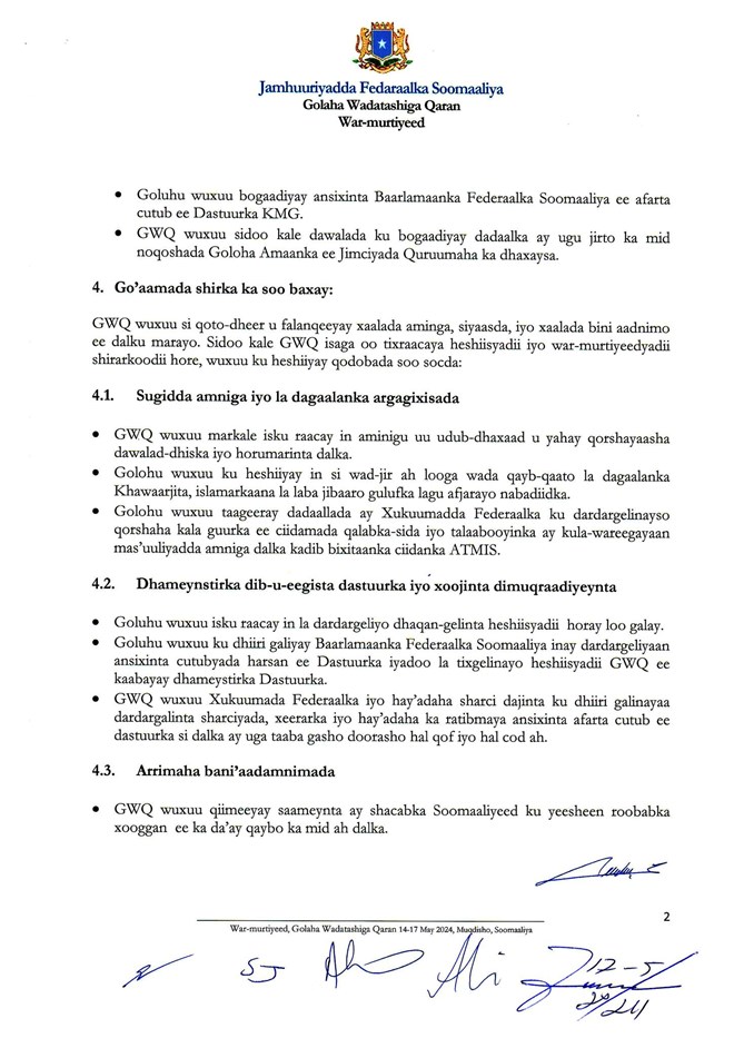 War murtiyeedka laga soo saaray Shirka oo ka kooban afar qodob ayaa lagu sheegay in Golaha ay ku heshiiyeen qodobo ay ka mid yihiin sugidda amniga, la dagaalanka Shabaab, Dhameystirka dib u eegista dastuurka, xoojinta dimuqraadiyeynta iyo arrimaha bani’aadanimada.