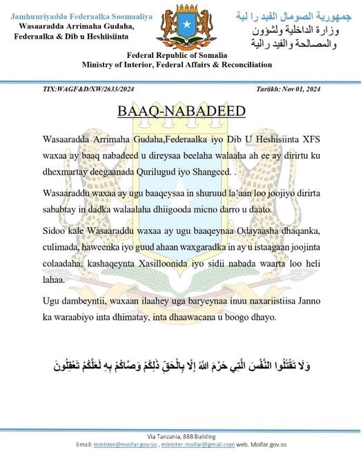Sabti, November, 2, 2024 (HOL) - Wasaaradda arrimaha gudaha, federaalka iyo dib u heshiisiinta dowladda Soomaaliya ayaa baaq nabadeed kasoo saartay colaado u dhaxeeya beelo walaalo ah oo ku dagaalamay deegaanada Qurilugud iyo Shangeed ee gobolka Togdheer.