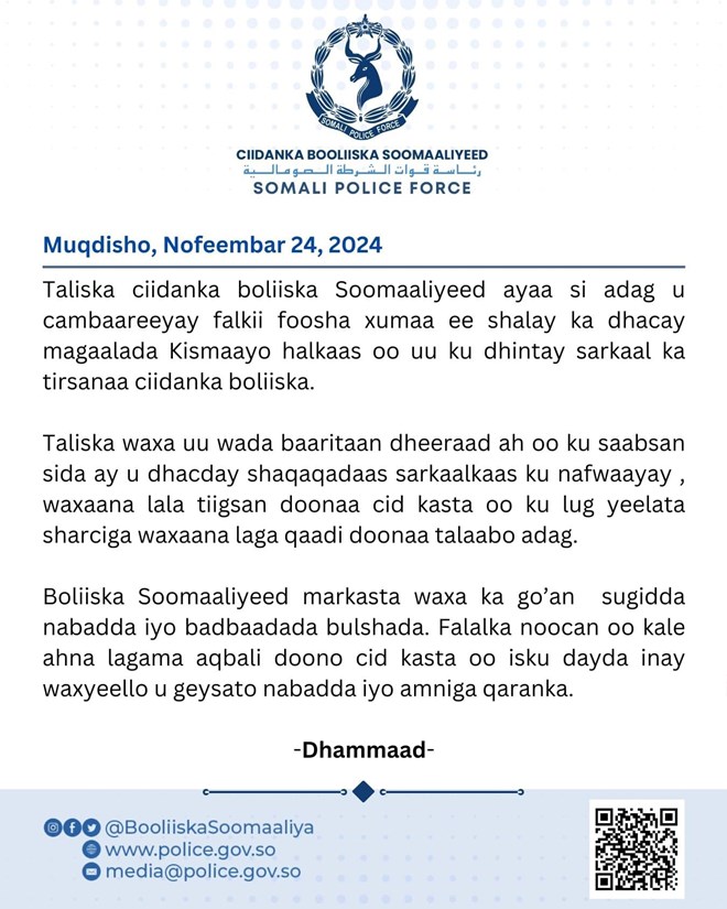 Axad, November, 24, 2024 (HOL) - Warsaxafadeed kasoo baxay Taliska ciidanka Booliiska Soomaaliya ayaa si adag loogu cambaareeyay iska hor imaadkii Shalay ka dhacay gudaha magaalada Kismaayo ee xarunta gobolka Jubbada Hoose ee uu ku dhintay sarkaal ka tirsana ciidanka Booliiska.