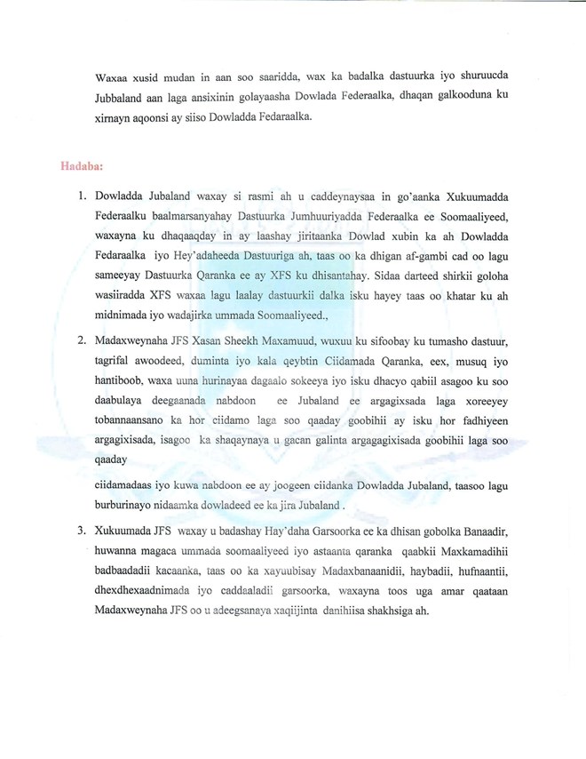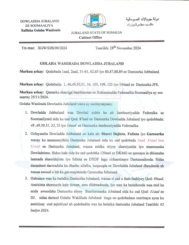 Golaha Wasiirrada Jubbaland waxay go'aamadaas ku sifeeyeen afgambi ka dhan ah nidaamka dastuuriga ah, iyagoo ku adkeystay in ay yihiin kuwo halis gelinaya dowladnimada Soomaaliya.