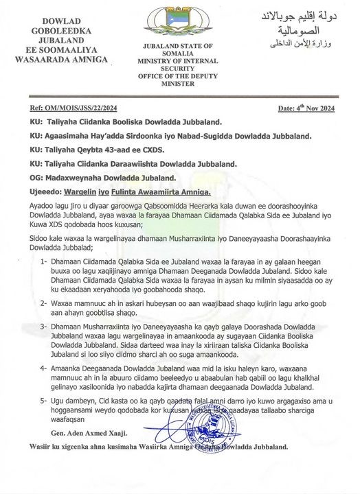 Talaado, November, 5, 2024 (HOL) - Wasaaradda amniga ee Dowladd Goboleedka Jubbaland ayaa soo saartay awaamiir culus oo taabanaysa sugidda amniga Doorashada ka dhacaysa Jubbaland iyo midada degaanada Maamulkaasi.