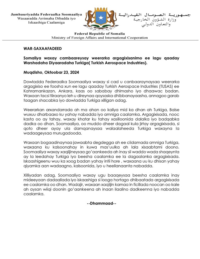 Khamiis, October, 24, 2024 (HOL) - Dowladda  Soomaaliya ayaa si kulul u cambaareysay weerarkii shalay lagu qaaday warshadaha hawada sare ee dalka Turkiga (TUSAS) ee magaalada Kahramankazan ee magaalada Ankara, kaasoo geystay khasaare kala duwan.