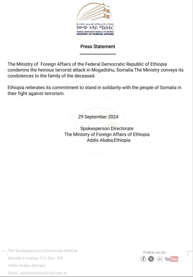 Axad, September, 29, 2024 (HOL) - Wasaaradda arrimaha dibadda dowladda federaalka Itoobiya ayaa cambaareysay qaraxii shalay  ka dhacay magaalada Muqdisho ee caasimadda Soomaaliya oo ay ku geeriyoodeen ugu yaraan shan qof oo rayid u badan.