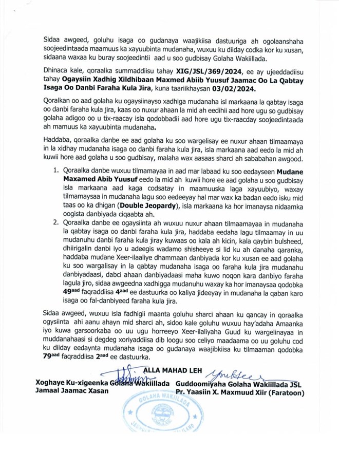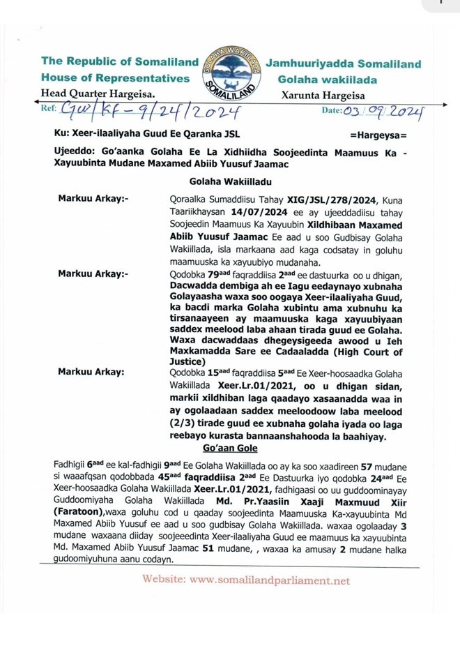 Talaado, September, 3, 2024 (HOL) - Golaha Wakiilada Somaliland ayaa laalay dacwadii xil ka qaadista ee ka dhanka ahayd Xildhibaan Maxamed Abiib Yuusuf.
