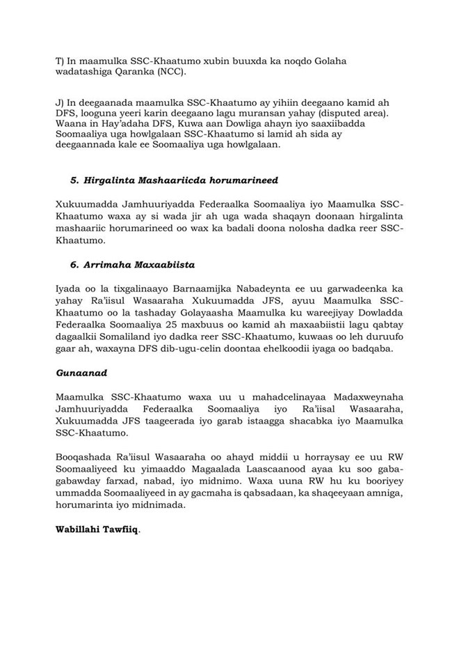 Waxaa sidoo kale la isla meel dhigay in maamulka SSC-Khaatumo uu noqdo dowlad goboleed rasmi ah iyo xubin buuxda oo ka tirsan Golaha Wadatashiga Qaranka (NCC), ayna deegaanadoodu yihiin qeyb ka mid ah dhulka Dowladda Federaalka Soomaaliya.