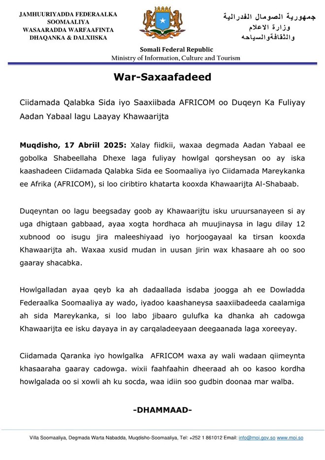 Khamiis, April 17, 2025 (HOL) - Warsaxafadeed kasoo baxay Wasaaradda Warfaafinta Soomaaliya ayaa lagu faahfaahiyay duqeyn culus oo Xalay fiidkii lagula eegtay gudaha degmada Aadan yabaal ee gobolka Shabeellaha Dhexe xubno ka tirsan kooxda Al-shabaab.