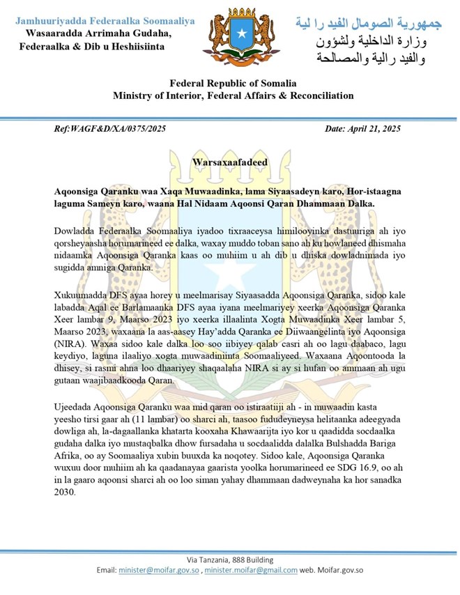Wasaaradda ayaa sheegtay inay ku boorineyso madaxda Puntland in ay si qaranimo leh uga qeybqaataan hirgelinta Aqoonsiga Qaranka, ayna bulshada deegaanka uga faa'iideeyaan nidaamka qaran ee horey loo dhisay.