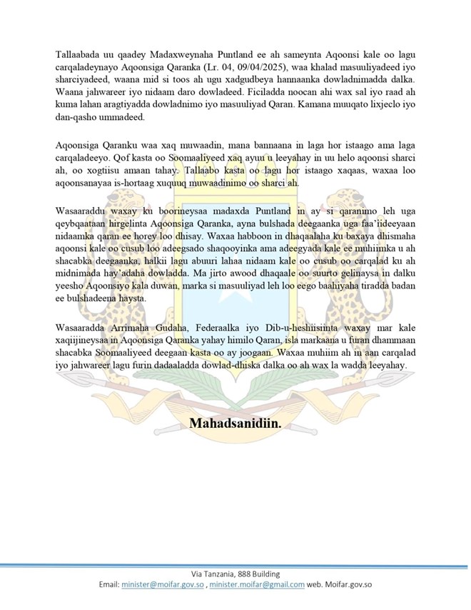 newsinside“Tallaabada uu qaadey Madaxweynaha Puntland ee ah sameynta Aqoonsi kale oo lagu carqaladeynayo Aqoonsiga Qaranka (Lr. 04, 09/04/2025), waa khalad masuuliyadeed iyo sharciyadeed, waana mid si toos ah ugu xadgudbeya hannaanka dowladnimadda dalka, Waana jahwareer iyo nidaam daro dowladeed, Ficiladda noocan ahi wax sal iyo raad ah kuma lahan aragtiyadda dowladnimo iyo masuuliyad Qaran. Kamana muuqato lixjeclo iyo dan-qasho ummadeed” ayaa lagu yiri warka kasoo baxay Wasaaradda arrimaha Gudaha Soomaaliya.