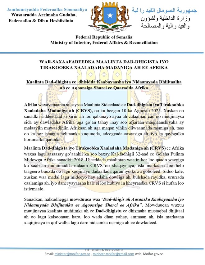 Axad, Agoosto 10, 2025 (HOL) - Wasaaradda arrimaha gudaha Xukuumadda Fedaraalka Soomaaliya ayaa soo saartay warsaxafadeed ay ku sharaxeyso muhiimadda uu leeyahay adeegga dad dhigista iyo tirakoobka madaniga, iyadoo la adeegsanayo hab casriga ah.