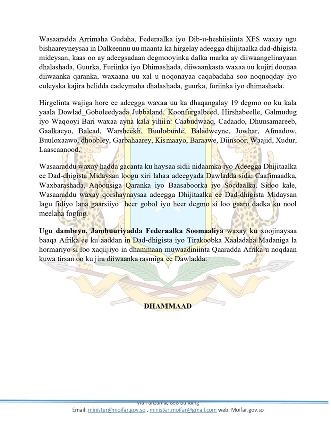Wasaaradda arrimaha gudaha Soomaaliya waxay sidoo kale qoraalkeeda ku sheegtay in 19 degmo oo ku kala yaala qaar ka mid ah dowlad goboleedyada dalka iney ka hirgelisay adeegga dhijitaalka dad dhigista mideysan.