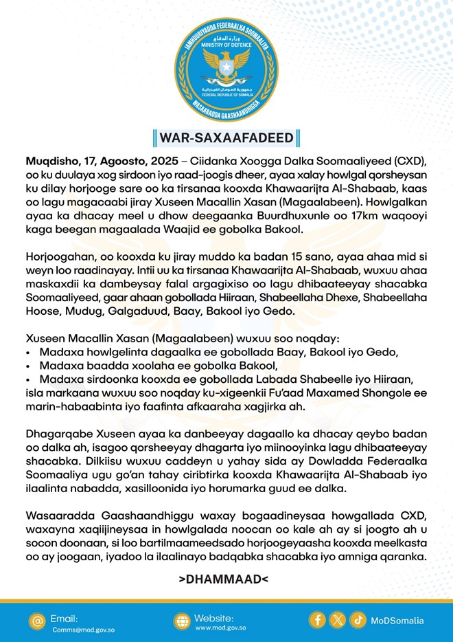 Axad, Agoosto 17, 2025 (HOL) - Warsaxafadeed kasoo baxay Wasaaradda Gaashaandhigga Xukuumadda Fedaraalka Soomaaliya ayaa lagu shaaciyay in howlgal qorsheysnaa oo ka dhacay deegaanka Buurdhuxunle ee gobolka Bakool lagu dilay sarkaal sare oo ka tirsana kooxda Al-shabaab.