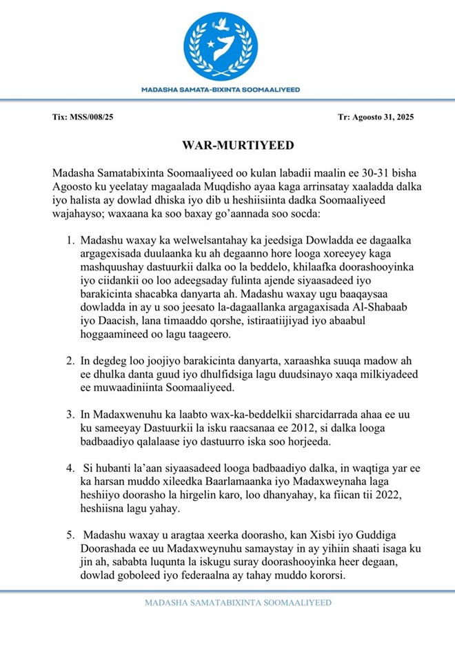 Axad, Agoosto 31, 2025 (HOL) - Madasha Samatabixinta Soomaaliyeed garabka uu hoggaamiyo madaxweynahii hore ee dalka Shariif Sheekh Axmed ayaa shir ay lahaayeen labadii maalin ee lasoo dhaafay kasoo saraay goordhaw go’aano culus iyo digniin ku socota madaxda dowladda Federaalka Soomaaliya.