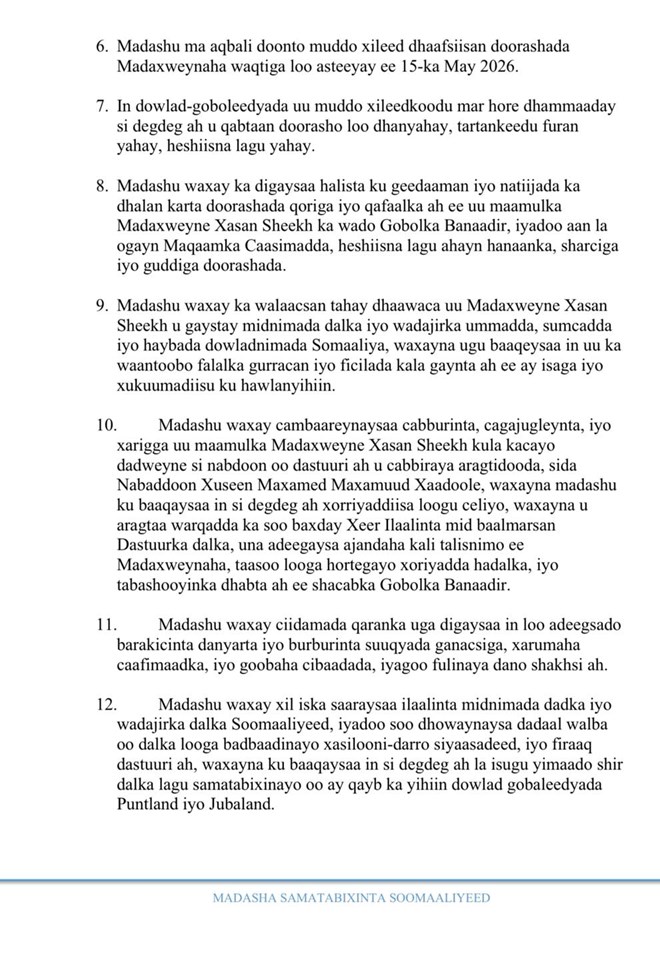 Waxaa sidoo kale Madashu ay qoraalkeeda ku cadeysay ineysan aqbali doonin muddo xileed dhaafsiisan doorashada Madaxweynaha Soomaaliya waqtiga loo asteeyay ee 15-ka May 2026.
