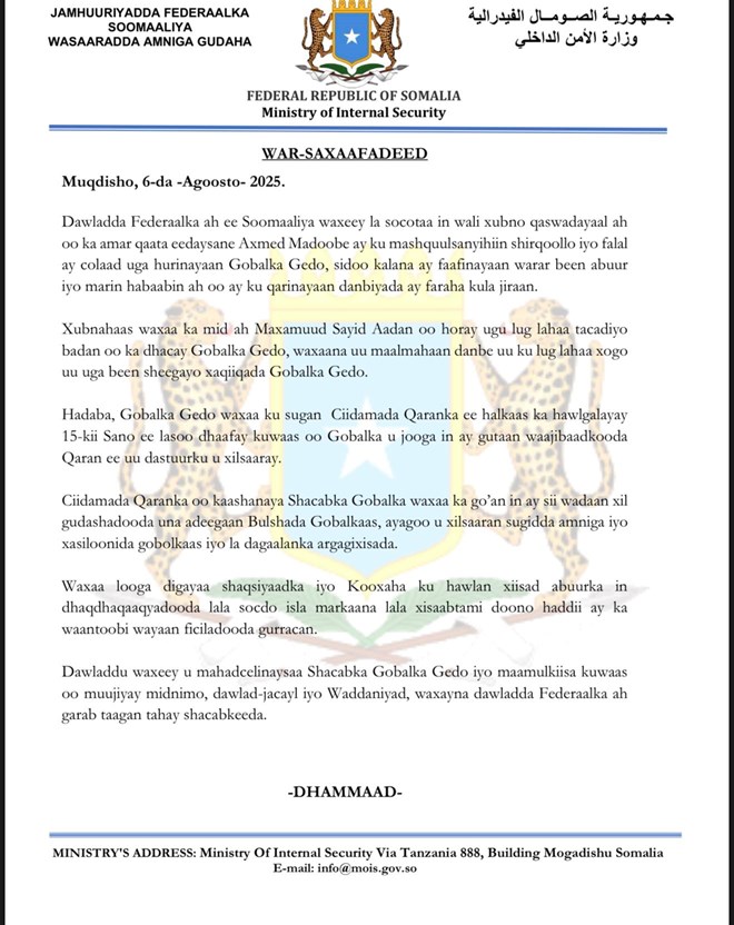 Khamiis, Agoosto 7, 2025 (HOL) - Wasaaradda amniga gudaha Xukumadda Federaalka Soomaaliya ayaa shaaca ka qaaday iney si dhaw ula socoto dhaqdhaqaaqyada xasilooni darada ah ee ka jirta gobolka Gedo.