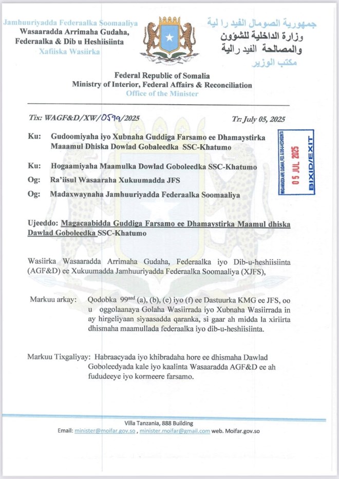 Sabti, Luulyo 5, 2025 (HOL) - Wasiirka Wasaaradda Arrimaha Gudaha iyo Dib u Heshiisiinta Xukuumadda Federaalka Soomaaliya Cali Yuusuf Cali Xoosh ayaa maanta wareegto uu soo saaray si rasmi ah ugu magacaabay guddiga farsamo ee dhameystirka maamul goboleedka SSC Khaatumo.