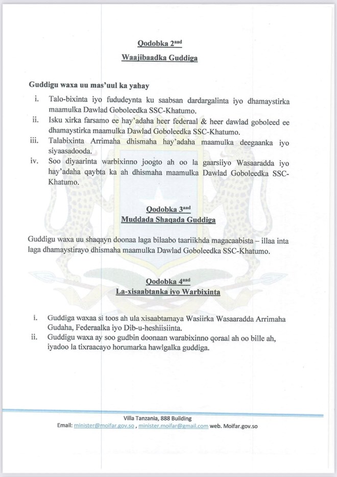newsinsideGuddigan farsamo ayaa ka kooban illaa 8 xubnood, kuwaas oo ay Wasaaraddu ugu talo gashay ka shaqeynta dhamaystirka iyo maamul u samaynta SSC Khaatumo, si waafaqsan habraacyada dastuuriga ah iyo siyaasadda dib u heshiisiinta qaranka.