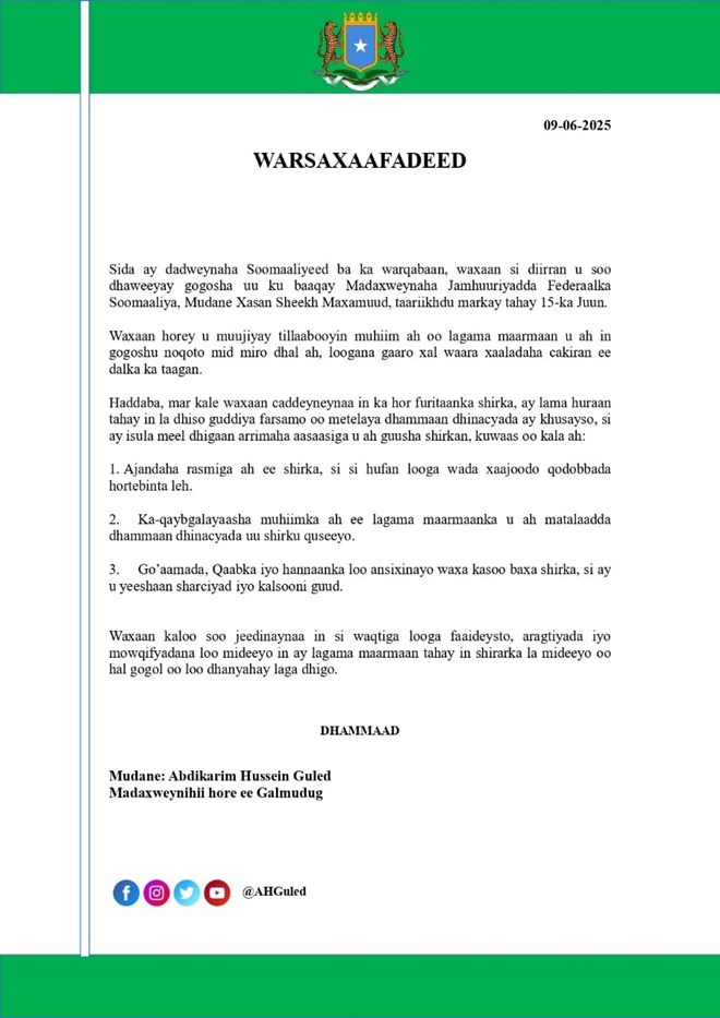 Talaado, Juun 10, 2025 (HOL) - Madaxweynihii hore Galmudug Cabdikariim Xuseen Guuleed ayaa sheegay in Dowladda Soomaaliya looga baahan yahay intaan la gaarin 15ka June ee la doonayo inuu dhaco Shirkii uu ku baaqay Madaxweyne Xasan Sheekh in la dhiso guddiyo farsamo oo ka ka socda dhinacyada ay gogosha quseeyso.