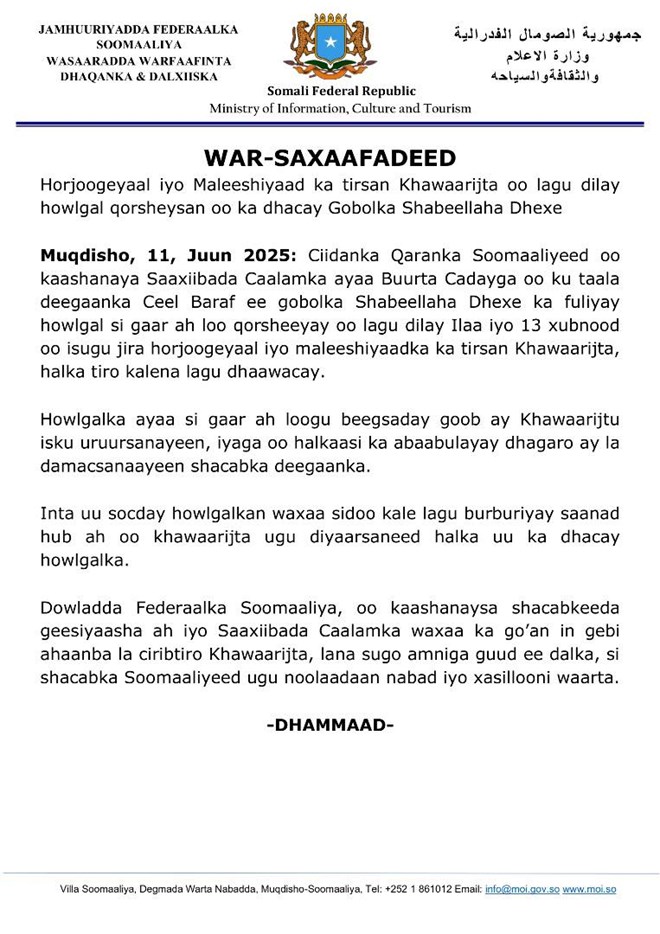 Arbaco, Juun 11, 2025 (HOL) - Ciidanka Xoogga Dalka Soomaaliyeed oo gacan ka helaya saaxiibada caalamiga ah ayaa howlgal qorsheysan ka fuliyay deegaanka Buurta Cadayga oo ku dhow Ceel Baraf, gobolka Shabeellaha Dhexe.