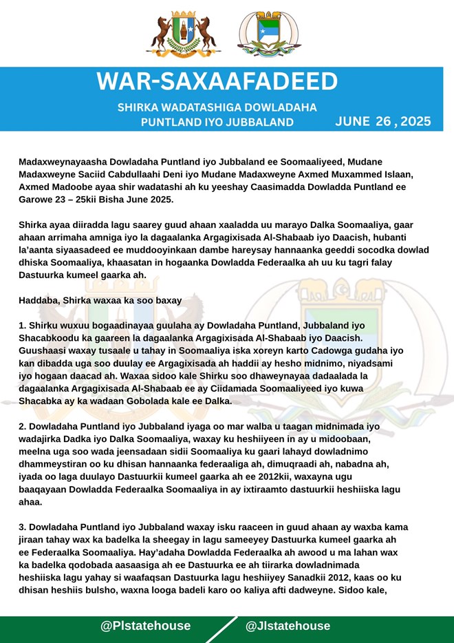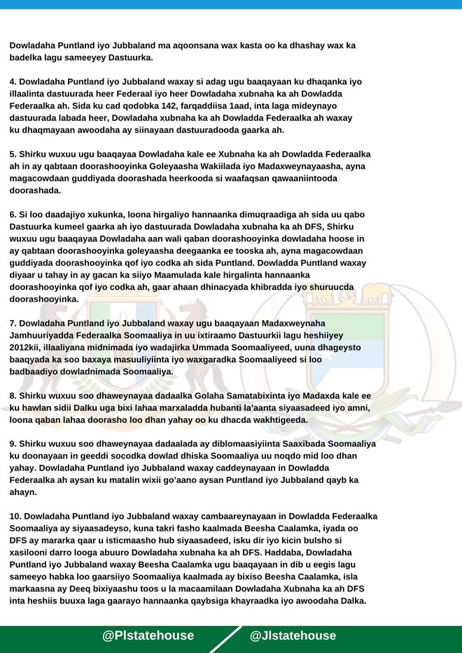 Labada madaxweyne oo saakay war-murtiyeed ka soo saaray magaalada Garowe, ayaa ugu baaqay beesha caalamka inay si toos ah ula macaamilaan dowlad-goboleedyada xubnaha ka ah Dowladda Federaalka Soomaaliya, inta laga gaarayo heshiis dhammeystiran oo ku saabsan qeybsiga kheyraadka dalka.