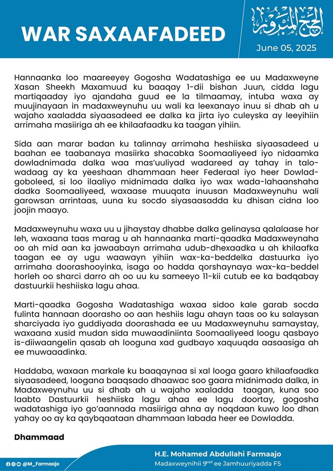 Khamiis, Juun 5, 2025 (HOL) - Madaxweynihii hore ee Soomaaliya Maxamed Cabdullaahi Farmaajo ayaa si weyn waxa uu u dhaliilay Hannaanka loo maareeyey Gogosha Wadatashiga ee uu Madaxweyne Xasan Sheekh Maxamuud ku baaqay 1-dii bishan Juun, cidda lagu martiqaaday iyo ajandaha guud ee la tilmaamay.