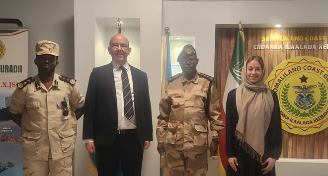 Axad, Maarso 16, 2025 (HOL) - Taliyaha Ciidanka Ilaalada Xeebaha Somaliland, Admiral Axmed Hure Haariye, iyo Madaxa Xafiiska Ciidamada ee Safaaradda Ingiriiska ee Nairobi, James Edwards, oo ay weheliso Madaxa Xafiiska Ingiriiska ee Hargeysa, Mrs. Cammilla, ayaa ka wada hadlay sidii ay u yeelan lahaayeen wada shaqayn buuxda.