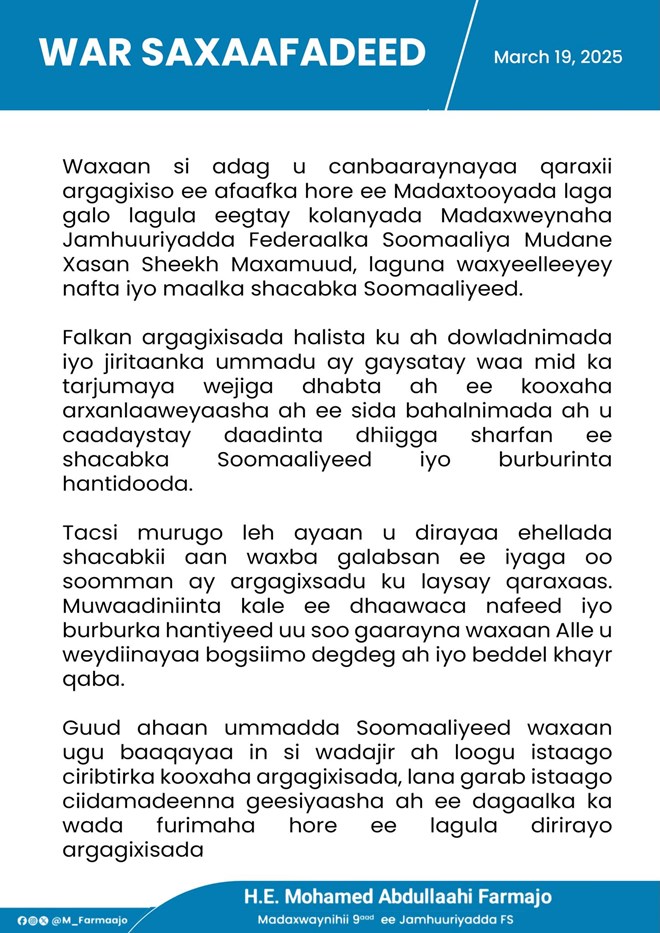 Khamiis, Maarso 20, 2025 (HOL) - Madaxweynihii hore ee Soomaaliya Maxamed Cabdullaahi Farmaajo ayaa si kulul ah u cambaareeyay weerarkii ay Al shabaab la damacsanaayeen inay ku qaarijiyaan Madaxweynaha Soomaaliya Xasan Sheekh Maxamuud oo maalmo ka hor ka dhacay isgooyska Ceel Gaabta ee Degmada Xamar Jajab.