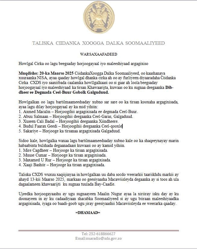 Jimco, Maarso 21, 2025 (HOL) - Taliska Militariga Soomaaliya ayaa war uu soo saaray ku faah faahiyay magacyada horjoogayaal iyo nabadoono ka tirsan Al shabaab oo saacadihii lasoo dhaafay lagu beegsaday bartamaha Soomaaliya.