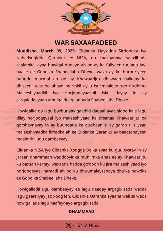 "Ciidanka Hay’adda Sirdoonka iyo Nabadsugidda Qaranka ee NISA, oo kaashanaya saaxiibada caalamka, ayaa howlgal duqeyn ah oo ay ka fuliyeen tuulada Aw-baalle ee Gobolka Shabeellaha Dhexe, waxa ay ku burburiyeen buundo macmal ah oo ay Khawaarijtu dhawaan halkaas ka dhiseen” ayaa lagu yiri qoraalka kasoo baxay hay'adda NISA.